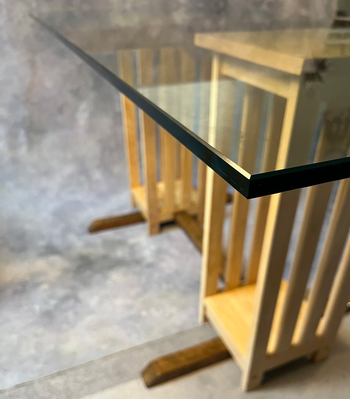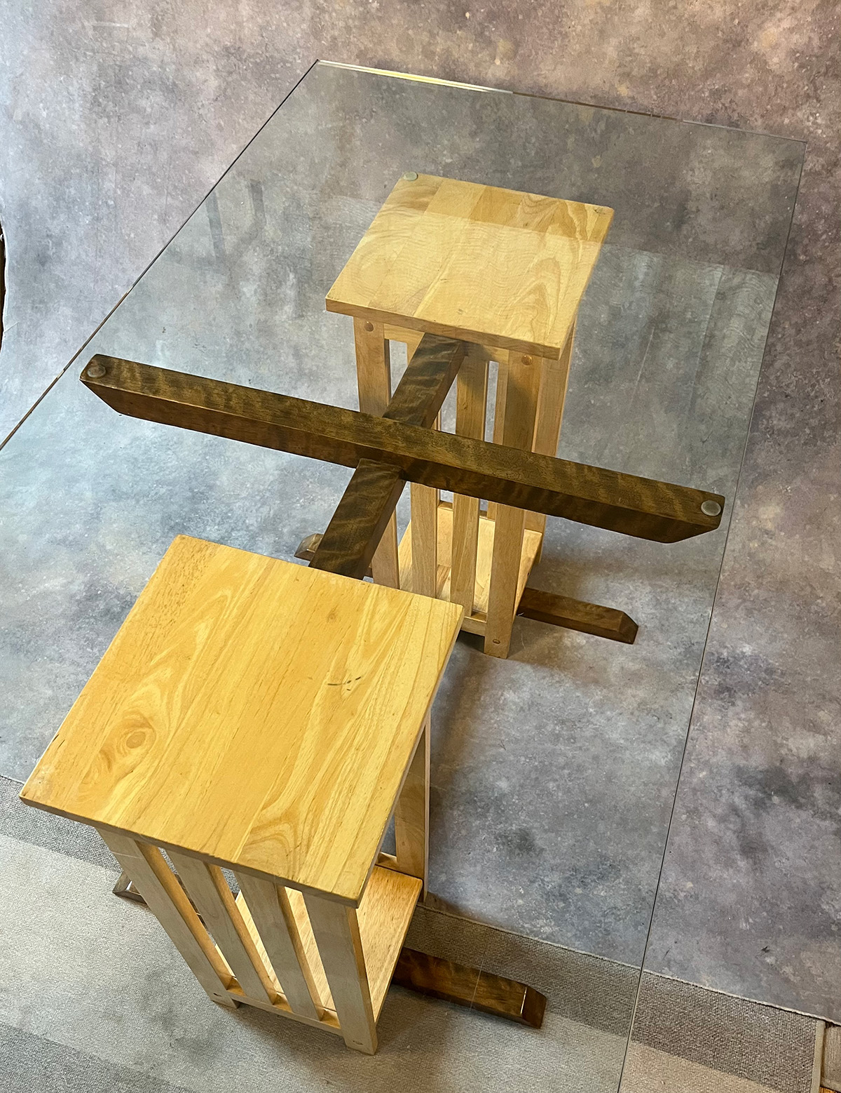 Designed with Black Walnut and Birch, this piece features a ¾” beveled edge glass top 55” x 66”, and is Designed to work with a set of 4 high-backed chairs.